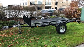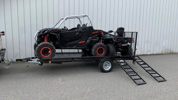 The Marlon Rat-02 Utility Trailer is the upgrade to our bestselling ATV trailer! The Rat-02 comes standard with steel floor decking with punched floor for grip! It is available in powder coated paint or galvanized finish. We have designed this trailer so that the loading ramps, hook on over the rear trailer frame for rear loading or hook onto the side bars for easy side loading of ATV's. The ends of each steel floor panel have notches cut out for securing straps. The loading ramps can be stored on the trailer in the front (pictures show storage of ramps in both front and back but that is no longer available). The Rat-02 complies with Canadian and US D.O.T. requirements. * Please note to obtain full capacity of trailer, side rails MUST be installed. |